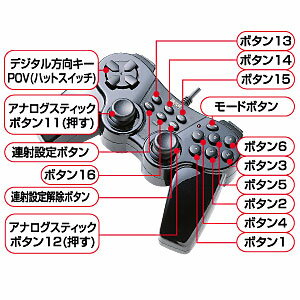 ●持ちやすい16ボタン仕様のゲームパッドです。●デジタル・アナログの切替えができます。●リアルな体感ができる振動機能対応です。●アナログスティック付で3Dシューティングなど幅広いゲームで楽しめます。●すべてのボタンに連射設定が可能です。■インターフェース:USB HID仕様バージョン1.1準拠※USB2.0インターフェースでもご使用になれます。■コネクタ形状:USBコネクタ(Aタイプ)■ボタン:16ボタン■サイズ:W167×D107×